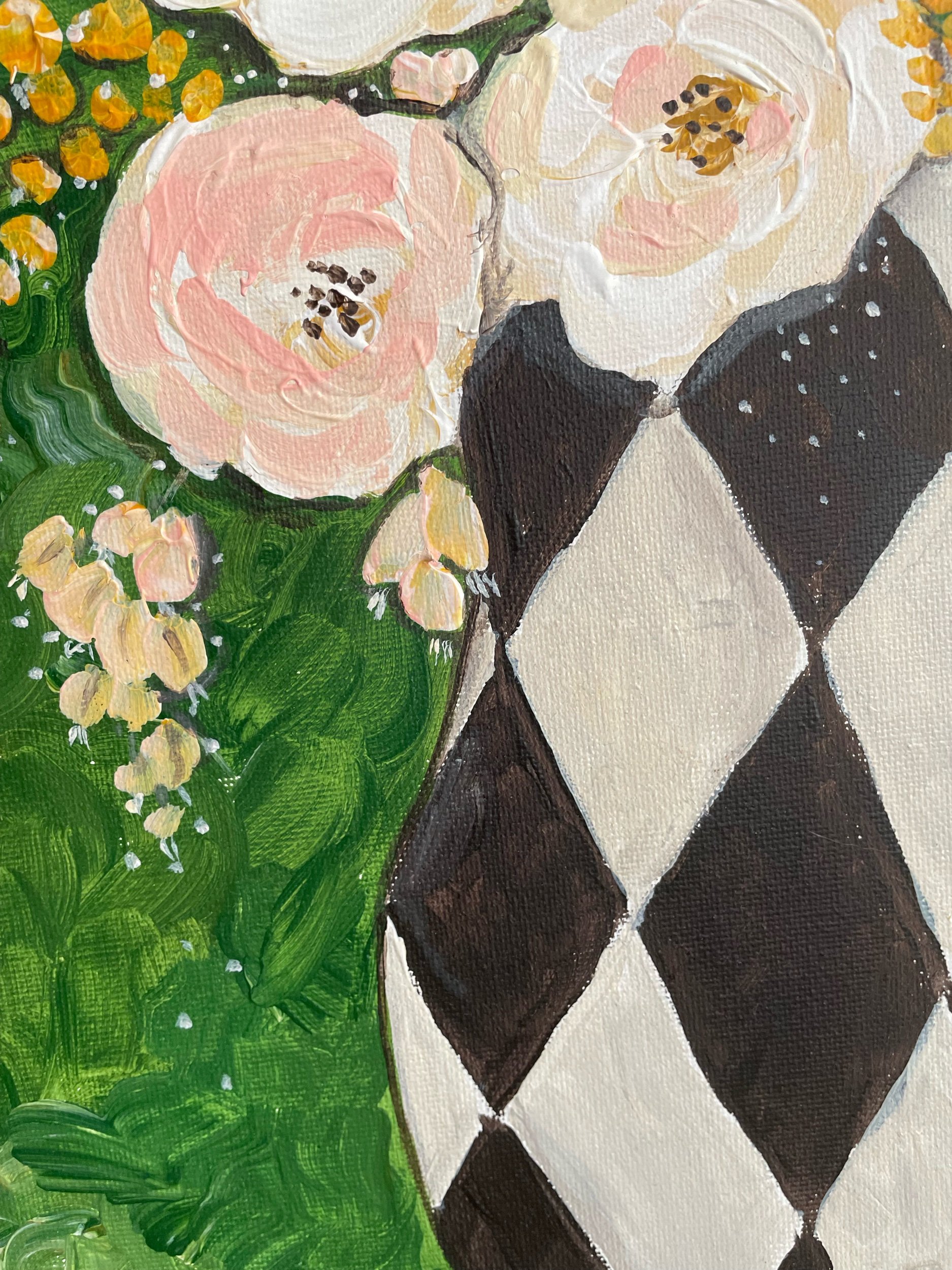 This original acrylic painting captures a delicate floral arrangement suspended between softness and structure. Built through expressive, visible brushstrokes, the rich texture gives each bloom depth and movement, inviting the viewer to experience the piece beyond the visual — almost tactile.